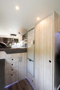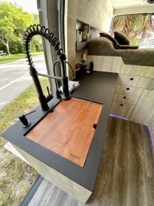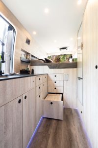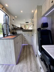 I used lightweight Italian plywood and realistic laminate surfaces to create a beautiful but durable environment. I like to use sleek lines, a premium dimmable LED lighting package and slim cabinetry to create a warm open feeling inside the van. High-End Fenix Countertops, No expense was spared and no shortcuts were taken when building this van.