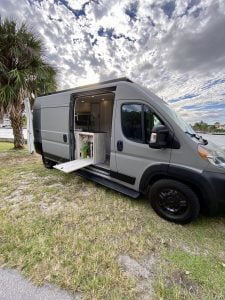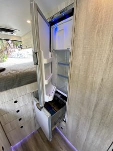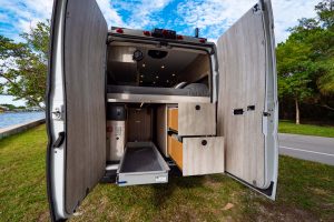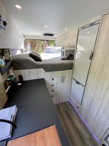 The van features a 3 point seat belt jumpseat that is bolted into the van chassis. This allows you to have a dedicated workspace and use the driver’s seat to swivel and face the rear for a 2 person dinette. The van also has a Vitrifrigo Slimtower 150 (a HUGE and premium fridge). It is a top-of-the line refrigerator that is AMAZING. In the garage, you have a LED light, heavy duty bike slide and outdoor shower. Like I mentioned before: Viper Alarm system, GPS tracking system, WeBoost Cell Signal Booster, Aftermarket 4k Rearview and Front Recording Camera and screen to film as you drive, Radiant Heating pad in the hallway. 12V outlet for charging on the move inside the top drawer and bookcase.
