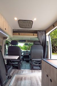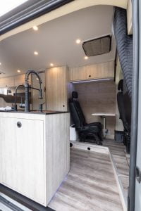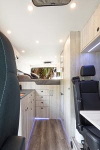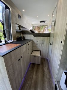 My vans are built with furring strips that are fastened to the van frame with rivnuts (not self tapping screws). This is a more labor intensive and costly method, but I build my vans to the highest standards. High end textured laminate cabinets (double the cost of formica), two heavy duty drawers in the garage (250lb capacity), a step-drawer to get into bed (500lb capacity), a Lagun table with two mounts, hidden bookcase behind the refrigerator reclaimed wood plank wall paneling, heavy duty vinyl wood plank floors, high end locking SouthCo latches throughout. Nice size closet, fold down table in the sliding doorway, real wood wall paneling, vinyl padded ceiling. 80/20 framing for the electrical and plumbing systems. High end FENIX composite sleek countertops.