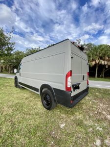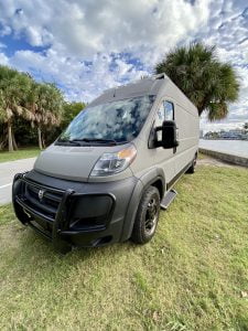 159” Ram Promaster diesel, 55,000 miles (diesel engines are known to last over 500k miles when properly maintained), diesel engines are also better for the environment because they get much better gas mileage. This van get 450-500 miles per tank about 20mpg. It also has computerized manual transmission. This drives EXACTLY like an automatic transmission. There is no shifting and no clutch. You drive it like an automatic. This helps on fuel as well. Rear backup camera and sensors, cruise control, power windows, mirrors and doors, bluetooth, keyless entry. I also added a Sumo Spring suspension system.