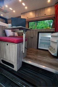 Josh’s vans are built with furring strips that are fastened to the van frame with rivnuts (not self tapping screws). This is a more labor intensive and costly method, but he builds his vans to the highest standards. High end laminate cabinets, two heavy duty drawers in the garage (250lb capacity), reclaimed wood plank wall paneling, heavy duty vinyl wood planks, high end locking SouthCo latches throughout.