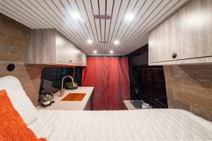 Josh used lightweight Italian plywood and realistic laminate surfaces to create a beautiful but durable environment. He likes to use sleek lines, a premium LED lighting package and slim cabinetry to create a warm open feeling inside the van. Quartz countertops are both extremely durable and good looking. No expense was spared and no shortcuts were taken when building this van.