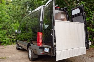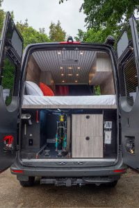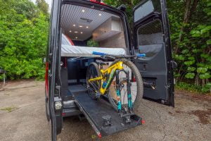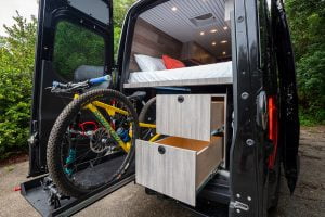 The van features a 3 point seat belt jumpseat that is bolted into the van chassis. This allows you to have a dedicated workspace and use the driver’s seat to swivel and face the rear for a 2 person dinette. The van also has a Vitrifrigo Slimtower 150. This is a top-of-the line refrigerator that is new to the market. In the garage, you have a LED light, heavy duty bike slide and outdoor shower.
