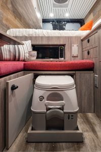 The plumbing system starts with an energy efficient Isotemp Slim 4 gallon water heater that taps into your engine coolant system to heat water. This allows you to conserve your energy for other uses. This van has a 20gal freshwater tank, 8 gallon greywater tank, ultra quiet Shurflo Revolution water pump, Ruvati sink and Vigo faucet that doubles as a bike wash/shower, there is a second heater shower in the rear of the van. 2.6 Dometic Cassette Toilet in closet.