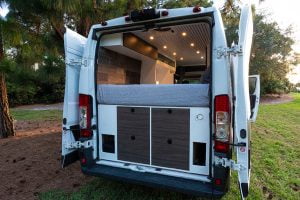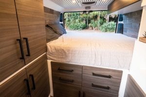 Josh’s vans are built with furring strips that are fastened to the van frame with rivnuts (not self tapping screws). This is a more labor intensive and costly method, but he builds his vans to the highest standards. High end laminate cabinets, two heavy duty drawers in the garage (250lb capacity), reclaimed wood plank wall paneling, heavy duty vinyl wood planks, high end locking SouthCo latches throughout.