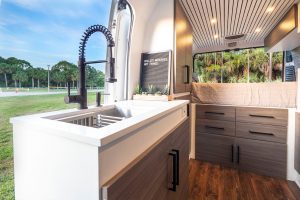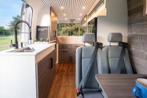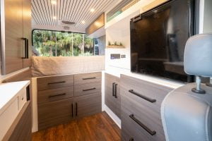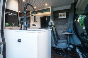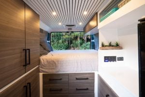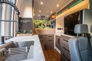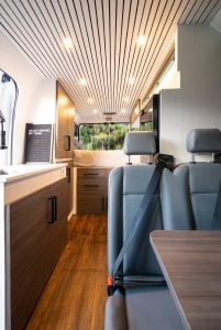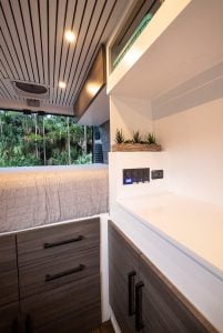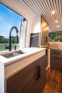 Josh uses lightweight Italian plywood and realistic laminate surfaces to create a beautiful but durable environment. We use sleek lines, a premium LED lighting package and slim cabinetry to create a warm open feeling inside the van. Corian countertops are both extremely durable and good looking. No expense was spared and no shortcuts were taken when building this van.