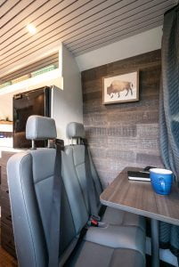 The van features a 3 point seat belt jumpseat that is bolted into the van chassis. This allows you to have a dedicated workspace and use the driver’s seat to swivel and face the rear for a 2 person dinette. The van also has a nice refrigerator that is mounted at eye level. In the garage, you have tons of drawer storage